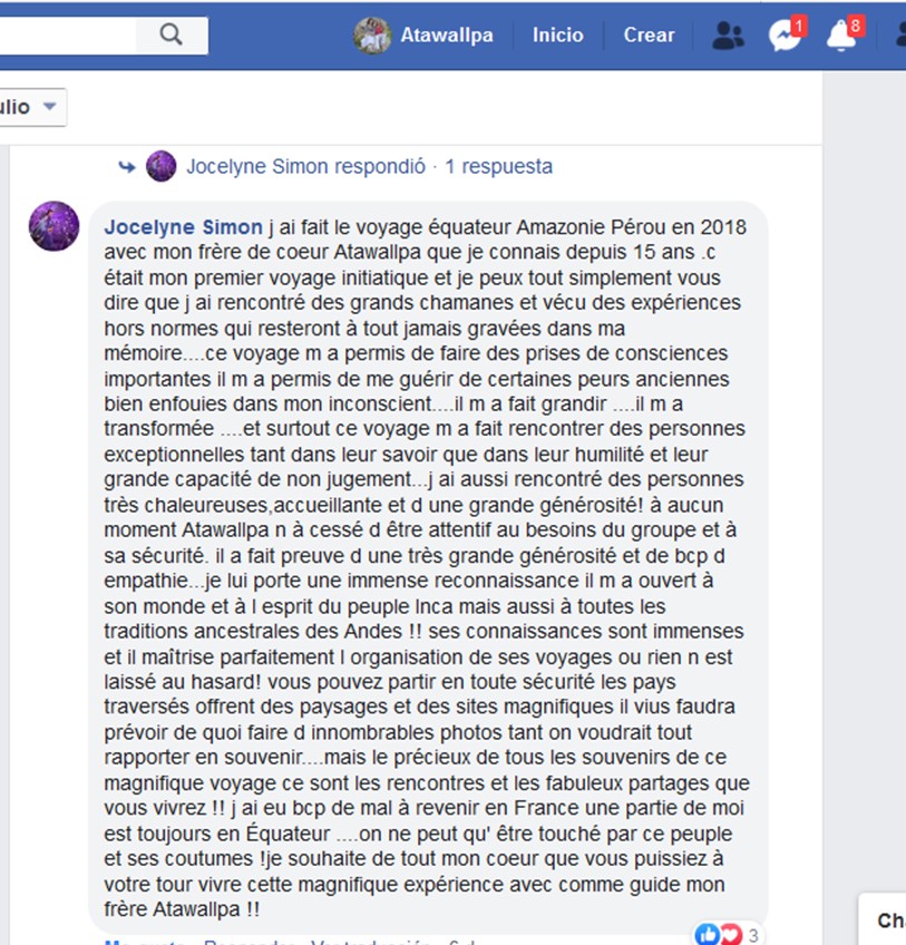 Je connais de nombreux praticiens du chamanisme en Équateur, et ceux que je présente sont parmi les plus intéressant . D'autre part, bien qu'ils offrent presque le même nombre de jours de voyage, nous les faisons traverser trois pays, et nous incluons dans notre tarif le vol Quito - Cusco et la visite à Machu Picchu, qui sont les plus chers du voyage vers Andes.
