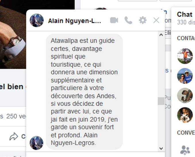 Je m'appelle Atawallpa Oviedo Freire, originaire des Andes, dans ce qu'on appelle aujourd'hui l'Équateur. Je suis dans le chemin initiatique depuis 30 ans. Depuis 16 ans, je parcours le monde en animant des ateliers, des cérémonies et des conférences, et depuis 11 ans, j'organise des voyages initiatiques dans les Andes (Équateur, Pérou et Bolivie). Je suis l'auteur de 9 livres, 3 traduits en français.